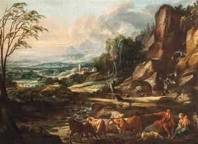 | Felsen mit Bach und Brücke, weitem Landschaftsausblick mit Hirtenfamilie sowie Rinder- und Schafherde | |