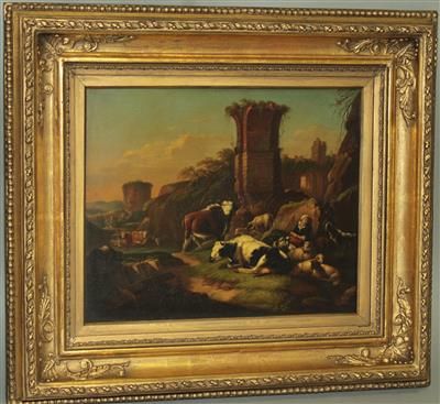 Ruhendes Vieh und Schäferin in der römischen Campagna