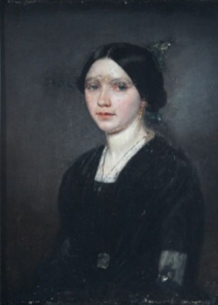 Halbporträt einer jungen Frau in schwarzem Kleid mit weißem Kragen