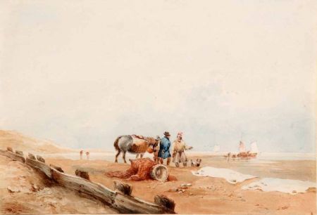 East Anglian Coastal Scene with Figures, Horse and Dog, Fishing Boats beyond