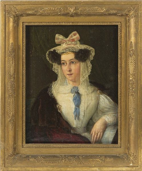 | Portrait of an Elegant lady wearing lace dress, lace head dress and fur trimmed cape | |