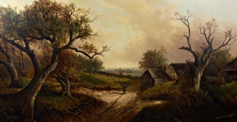 Traveller on a lane by an old farmhouse with maid feeding chicks