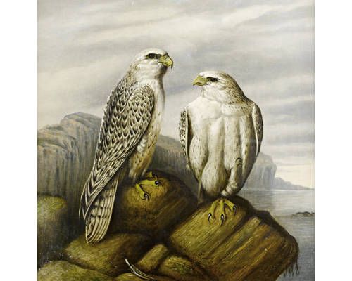 Gyr falcons on a rocky ledge