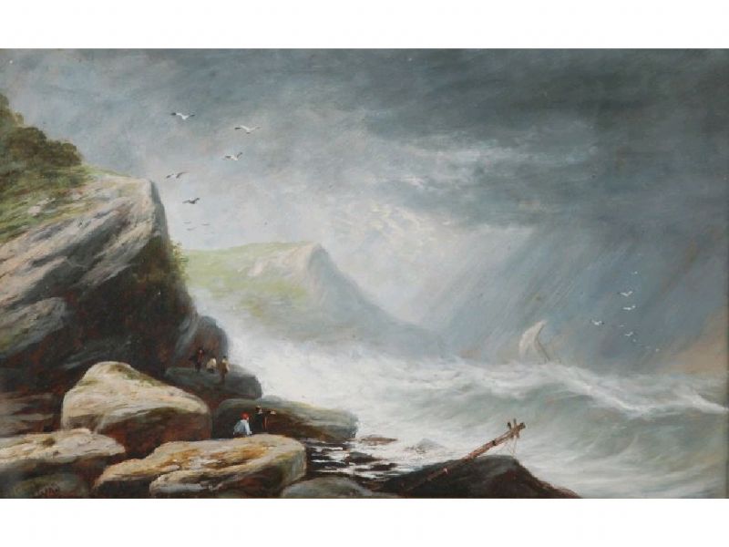 | STORMY COASTAL SCENE WITH FIGURES and masted sailing ship in distress | |