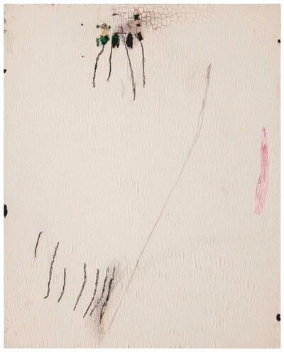 | Unknown rabbit skin glue, calcium carbonate, white pigment, ink, watercolor, graphite and wax crayon on panel | |