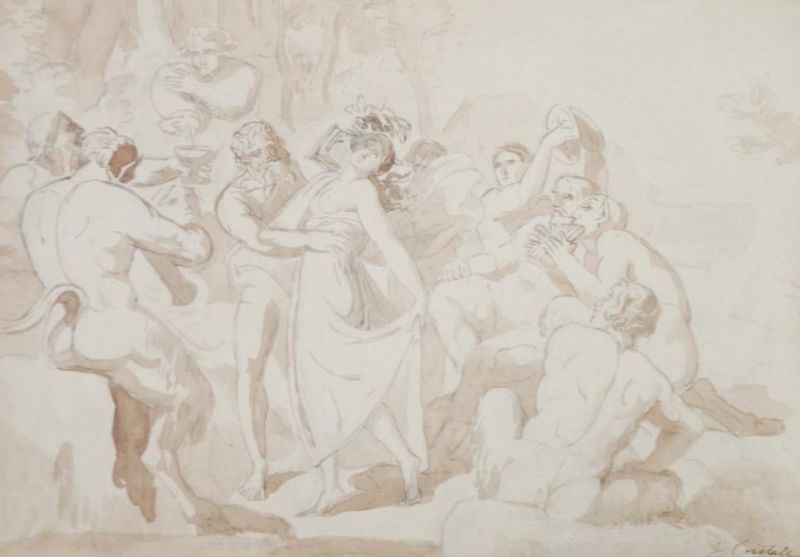 | A Bacchanalian revelry with a nymph dancing with a bearded male with fauns and other figures merrymaking | |