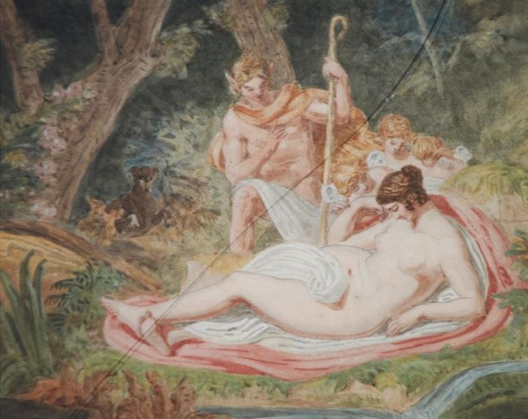 | Naked nymph reclining asleep, looked upon a satyr and putti, a dog emerging from a woodland beyond | |