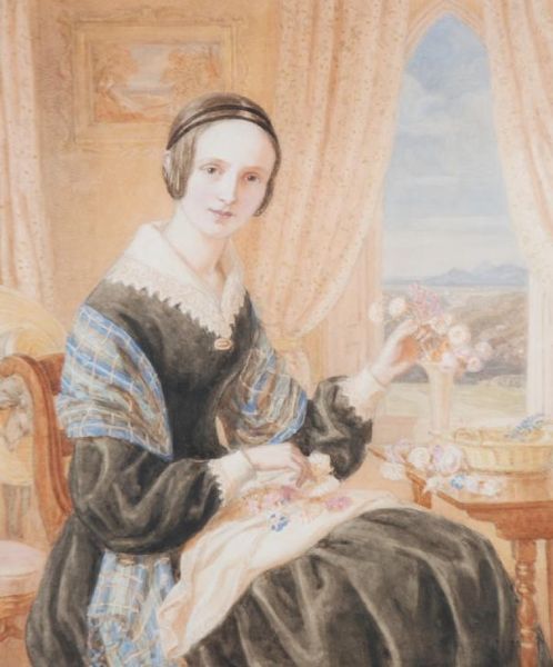 | Portrait of Marie Pritchard, seated before a window arranging flowers in a vase | |