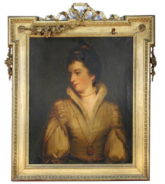 | Portrait of a Lady, wearing a single strand pearl choker, and a portrait miniature locket on a gold chain | |