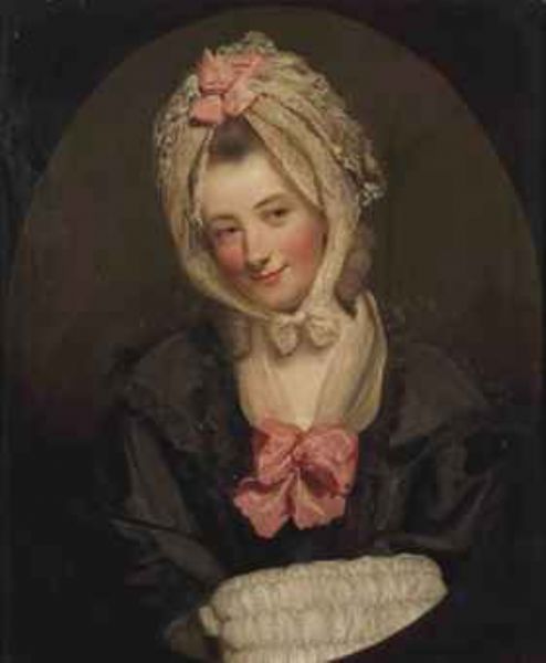 | Portrait of Catherine Schindlerin, bust-length, in a black coat and white neck and head scarf with pink bows, holding a muff, in | |