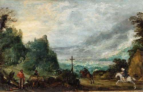 MOUNTAIN LANDSCAPE WITH HORSEMAN AND WOODCUTTER