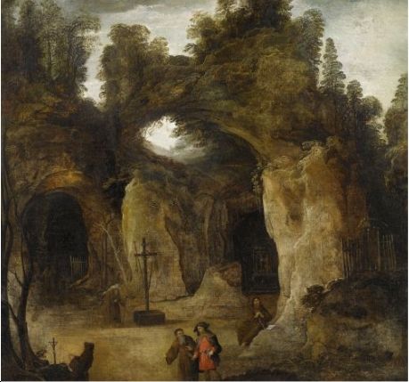 Grotto landscape with hermits.