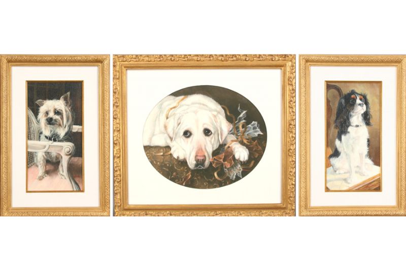 Portrait of three dogs, white labrador retriever, yorkie terrier, and King Charles spaniel.