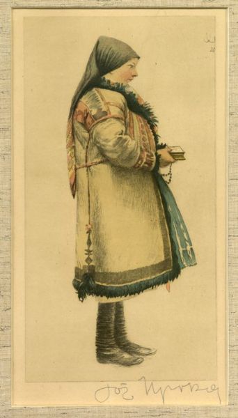 Dívka v kožuchu s růžencem a knihou