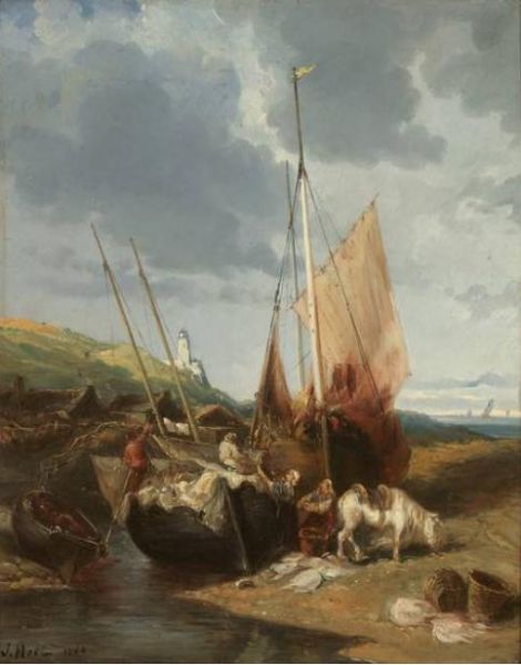 | Uferstück bei Ebbe mit Fischerbooten und Personenstaffage an einem sonnigen Morgen | |