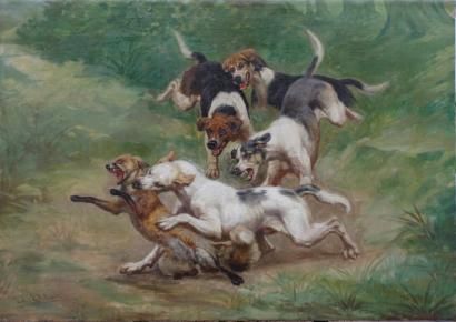 Quatre chiens prenant un renard