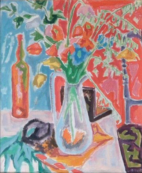 Nature morte au broc de fleurs et bouteille.