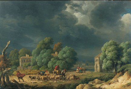Bergers et troupeaux se repliant à l'arrivée de l'orage