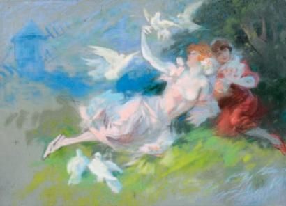 Elégantes aux colombes dans un paysage bucolique