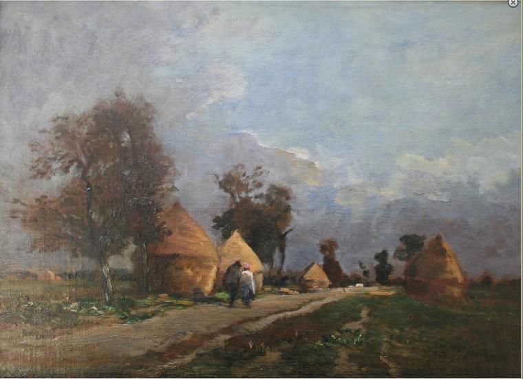 TWO FIGURES ON A PATH NEAR HAYSTACKS