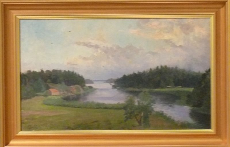 Insjölandskap med hus