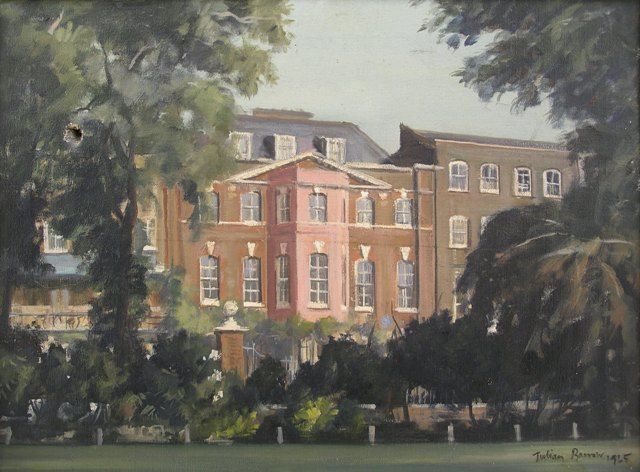 | Mansions from a park setting with mature trees and wrought iron railings in the foreground, and high windows behind | |