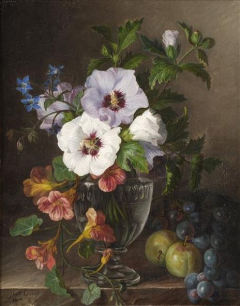| Nasturtium in a glass vase with grapes and greengages on a stone ledge Peonies, convolvulus, narcissi and yellow lilies in a gla | |