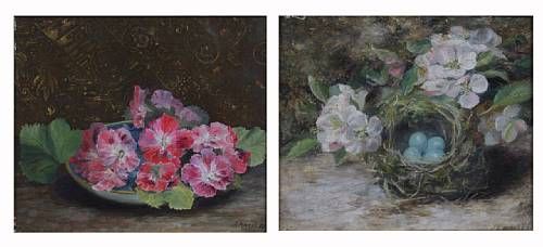 Apple blossom and a bird's nest; pelargoniums in a saucer