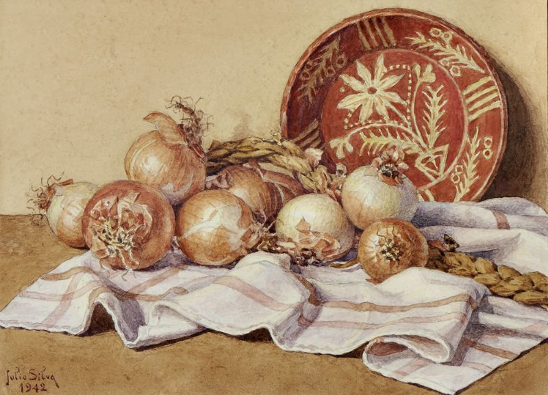 Natureza morta com cebolas e tijela em faiança