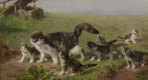 Katzenmutter mit ihren Jungen auf der Wiese.