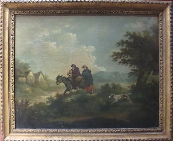 | A wooded landscape with peasants travelling with a donkey and a dog, cottages beyond | |