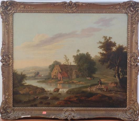| Extensive river landscape with huntsman, hounds and cattle | |