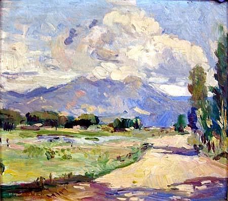 | LANDSCAPE WITH MOUNTAIN IN DISTANCE AND ROAD THROUGH MEADOW | |