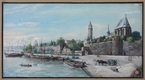 | Blick auf Hoechst (heute Frankfurt a. M.) mit Justinuskirche und Zollturm vom Main aus mit reicher Schiffsstaffage, im Hintergru | |