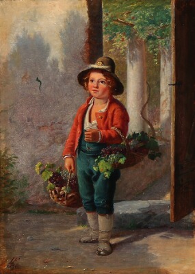 | A little boy at a doorway with baskets of grapes. | |