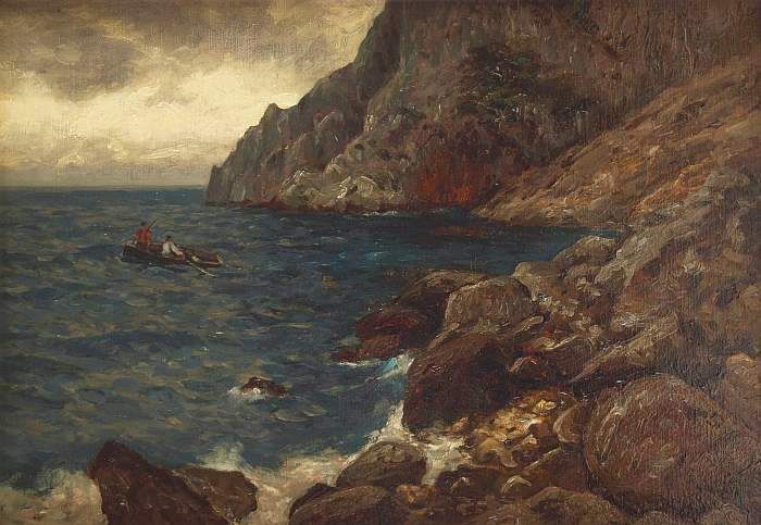Ruderboot vor felsiger Küstenlandschaft