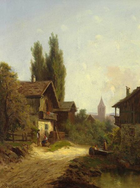 Kirchdorf mit Figurenstaffage an einem Sommertag