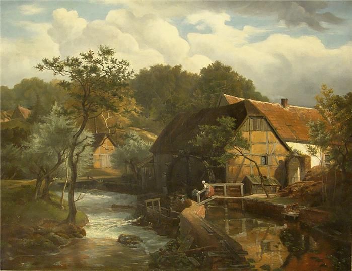 Wassermühle mit Bauern an einem rauschendem Bach.