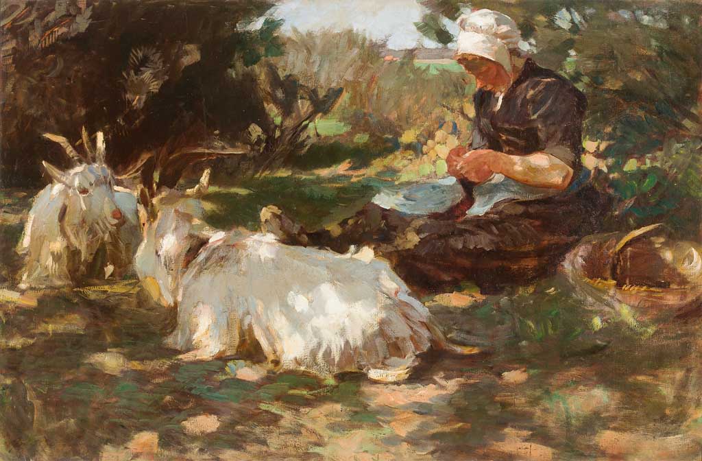 Hirtin mit Ziegen in Sommerlandschaft mit prachtvollem Lichteinfall