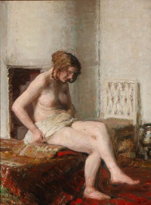 A female nude sitting on a bed