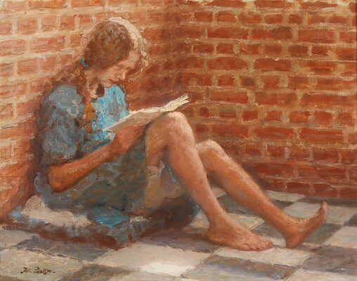 Girl reading a book leant against a brick wall
