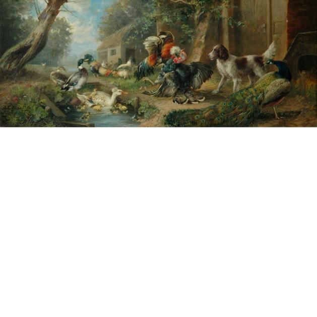 | A Barnyard Cock Fight Watched by a Spaniel, a Peacock and Other Fowl | |