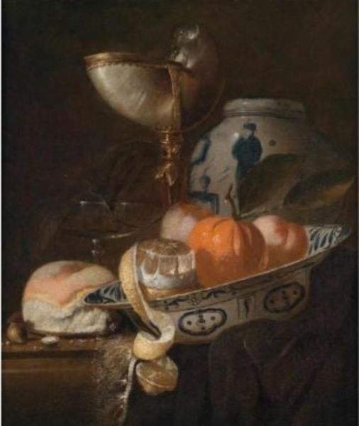 | Still life with a nautilus goblet, a Chinese vase and a Wanli bowl, with half a lemon and other citrus fruits | |