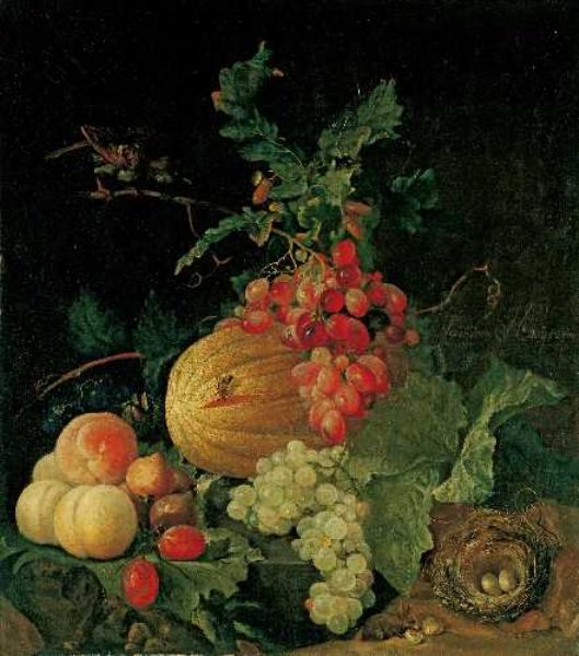 STILLLEBEN MIT FRÜCHTEN UND EINEM VOGELNEST.