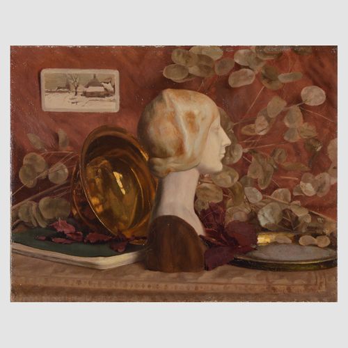 A STILL LIFE OF A SCULPTURE OF A LADIES HEAD, A COPPER BOWL AND BRANCHES