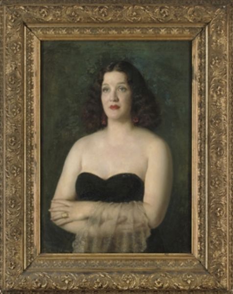 Portrait of a woman, half-length, in a black evening dress with a lace stole