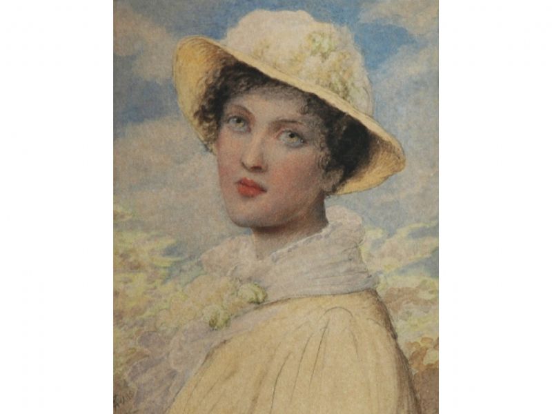 Bust portrait of a lady in yellow dress matching hat and white scarf