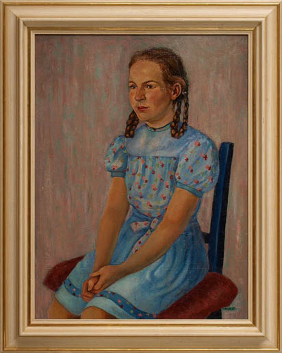 Portrait eines Mädchens in blaume KLeid und mit geflochtenen Haaren, auf einem Stuhl sitzen