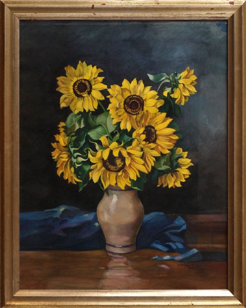 Sonnenblumenstrauß in einem salzglasierten Keramikkrug neben einem gefalteten Tuch