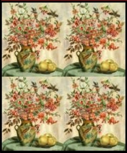 Blühende japanische Scheinquitte in Vase mit Drachenmotiv und Teller mit Äpfeln